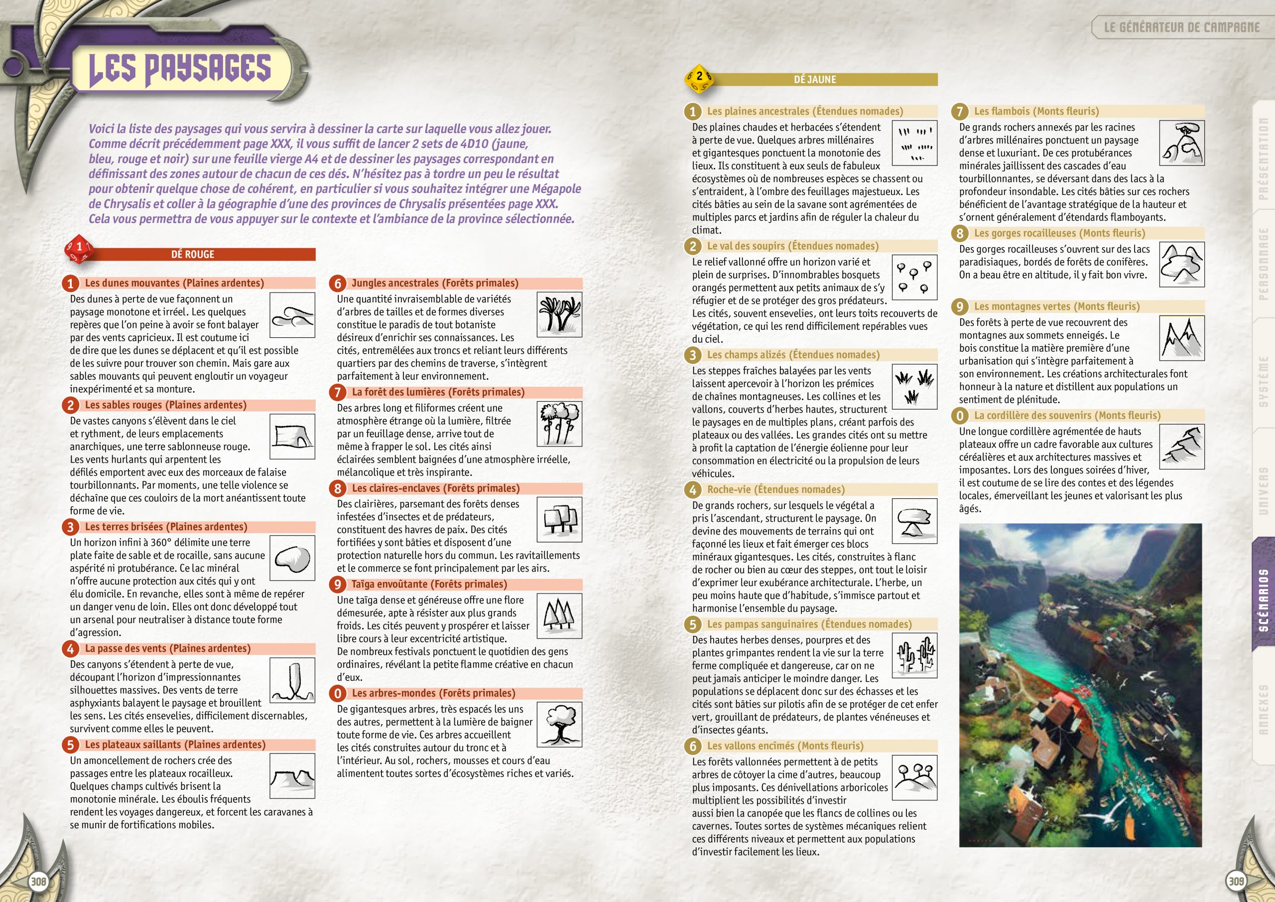 • un exemple de cadre de jeu et un scénario jouable avec trois prétirés pour vous donner un exemple parmi tant d’autres de l’utilisation de ce générateur de campagne.